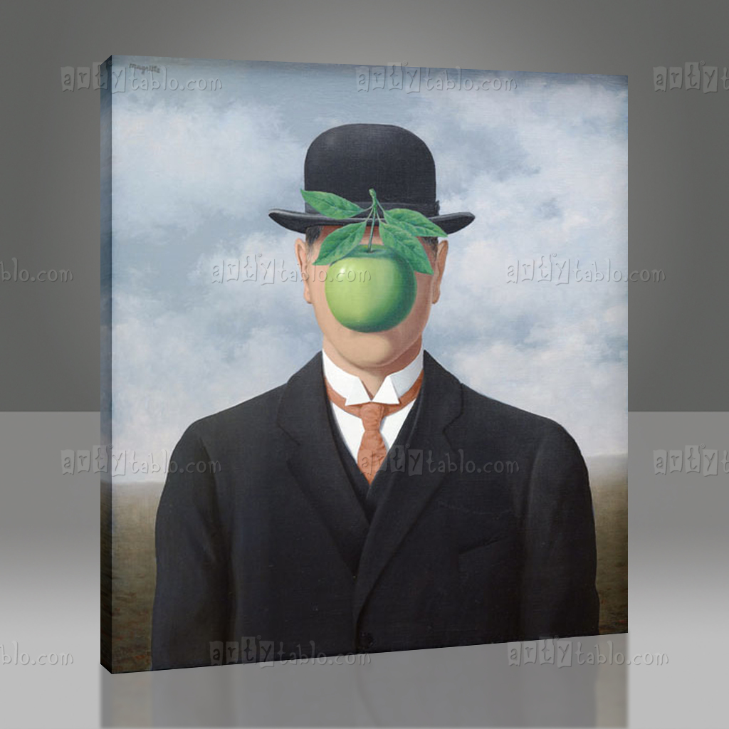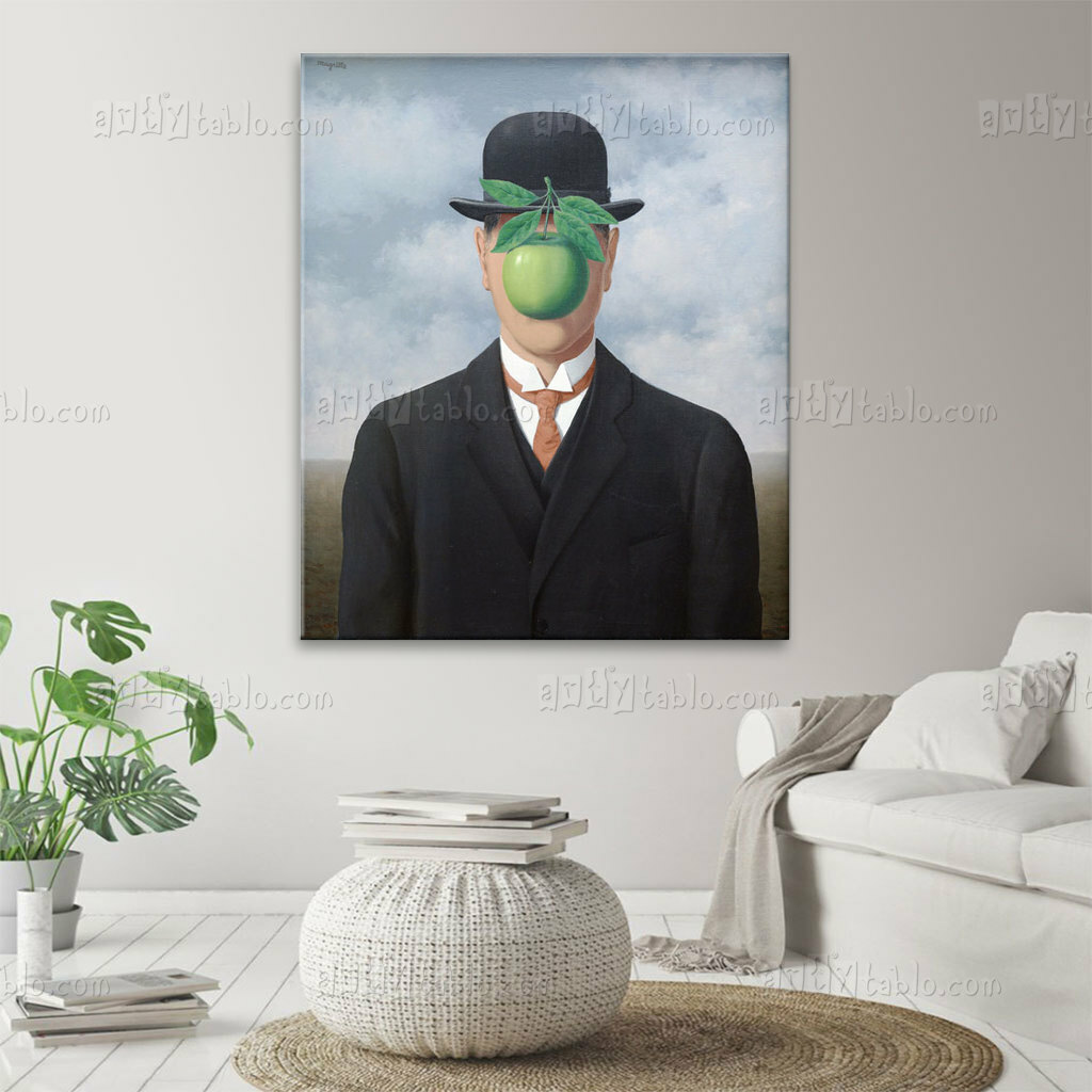 “The Son of Man“, 1964 yılında tamamlanan bir yağlı boya tablodur ve Magritte’in imzası niteliğindeki görsel sembollerle doludur. Tablo, bir adamın gövdesi tamamen takım elbiseyle kaplıyken yüzünün bir elma ile gizlendiği bir portreyi tasvir eder. Elma, parlak yeşil yapraklarıyla birlikte adamın yüzünü tamamen örtmemekte, ancak yüzünü belli belirsiz bir şekilde gizlemektedir. Bu yüzden, izleyiciye tam bir portre görmek yerine, yüzün arkasındaki gizemi ve bilinmeyeni sorgulama fırsatı sunar.